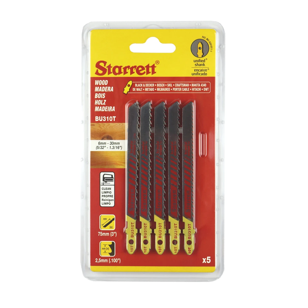 Starrett Bi-Metal Unique™ Saw Technology, with Unified Shank™ Jigsaw Blades will fit in virtually all jigsaw machines. Our Unique™ Blades feature 170% more weld contact area than standard bi-metal blades through the Unique™ solid state diffusion bonding process. This ensures exceptionally strong teeth, combined with the multiple cutting edges and split chip advantage, ensuring that Starrett Jigsaw Blades typically last 25% longer than directly competing products.