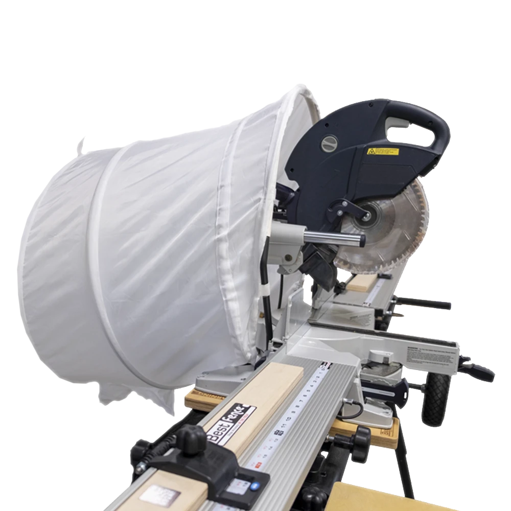 The Saw Hood was designed by a general contractor to eliminate the catastrophic dust problem created by miter saws. It sets up in seconds and contains 95% of the dust. You will be amazed at how effective this product is.